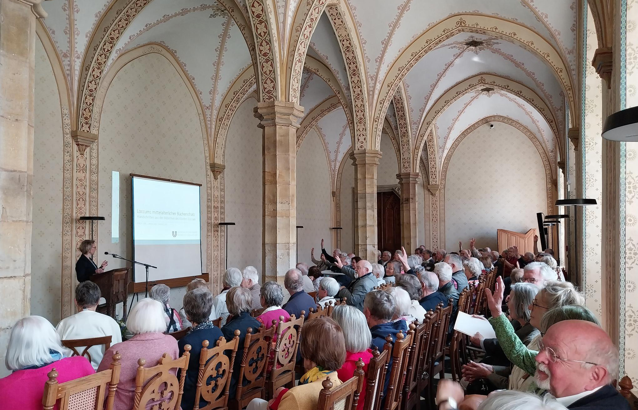 Zu Beginn referierte Professorin Dr. Caroline Emmelius über einige mittelalterliche Bücherschätze des Klosters Loccum. In den anschließenden Workshops wurde das Thema durch die Bibliotheksführungen mit Diplom-Bibliothekar Jörg Fiedler M.A. und Prior Arend de Vries vertieft. Zeitgleich erklärte Dr. Janis Berzins anschaulich das Klangspektrum der Seifert-Orgel.